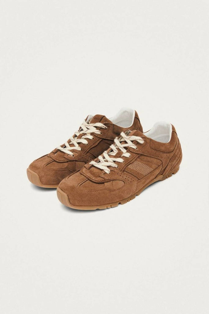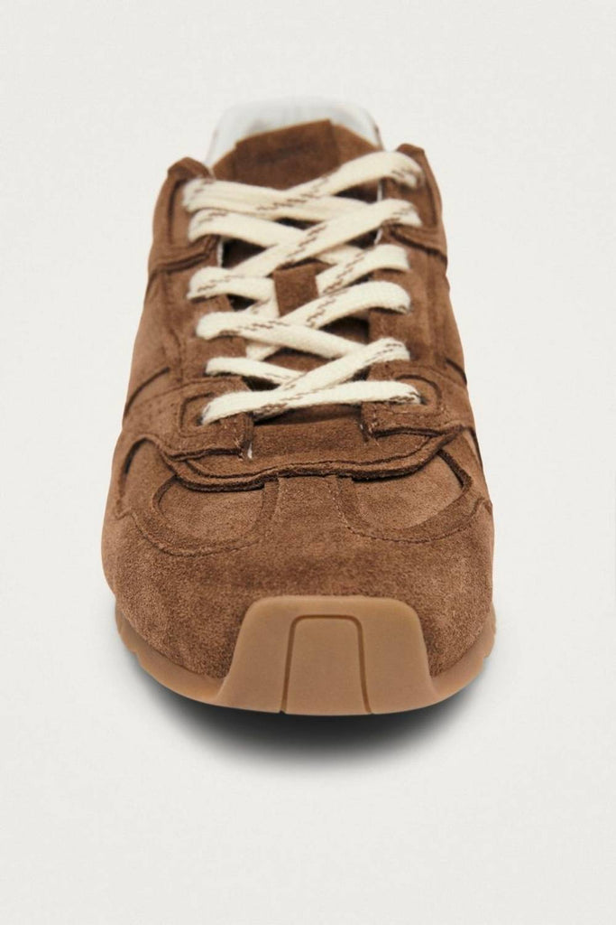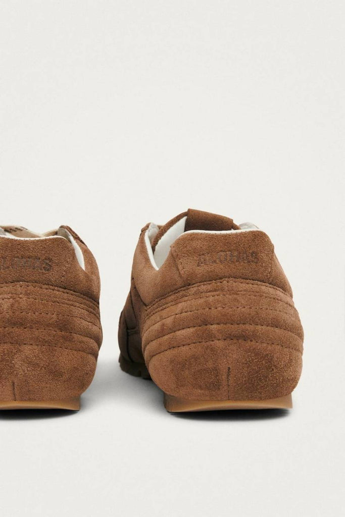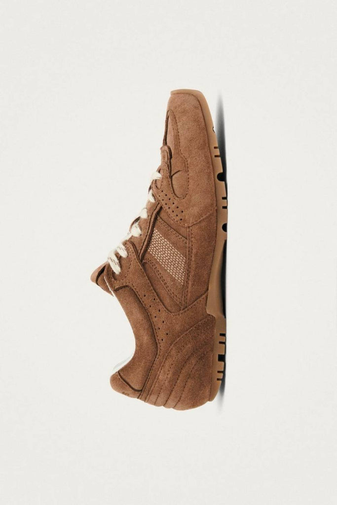 Diseñadas con una construcción de varias capas, las nuevas TB.56 están confeccionadas en ante marrón con paneles superpuestos que añaden profundidad y dimensión. Este estilo presenta una silueta baja, suelas de goma marrón, cordones marmolados color crema que añaden contraste y detalles clásicos como costuras expuestas y logotipos estampados.