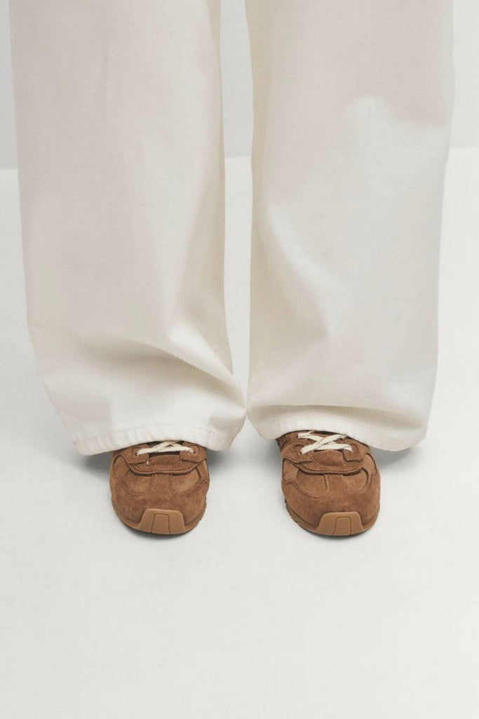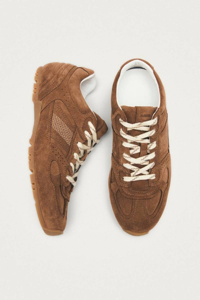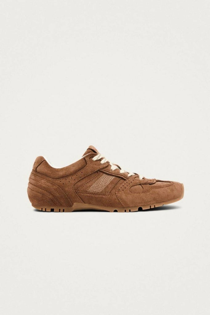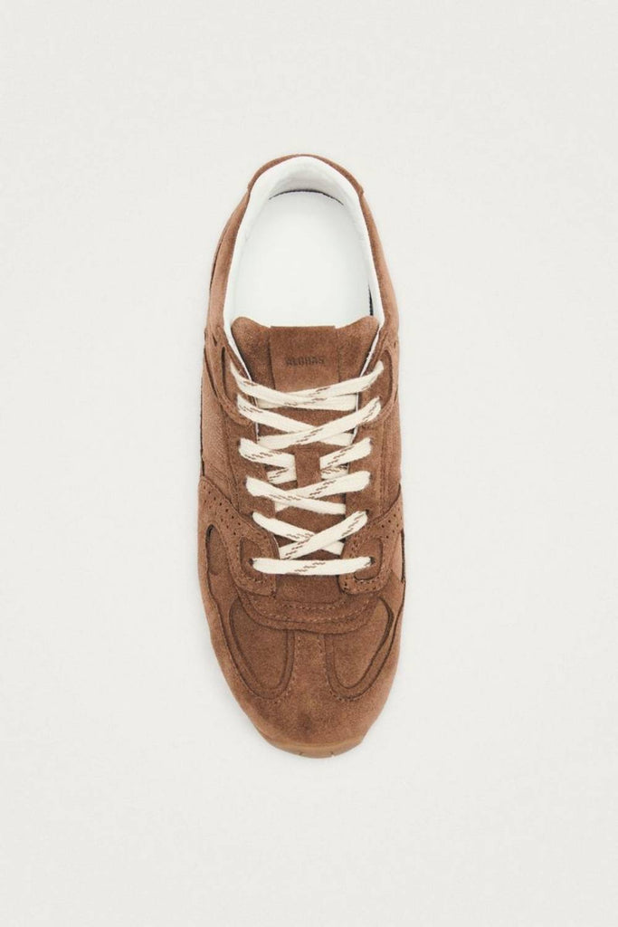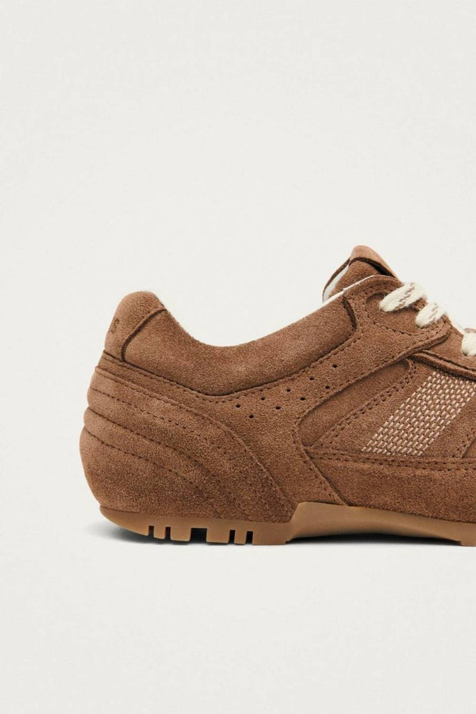 Diseñadas con una construcción de varias capas, las nuevas TB.56 están confeccionadas en ante marrón con paneles superpuestos que añaden profundidad y dimensión. Este estilo presenta una silueta baja, suelas de goma marrón, cordones marmolados color crema que añaden contraste y detalles clásicos como costuras expuestas y logotipos estampados.