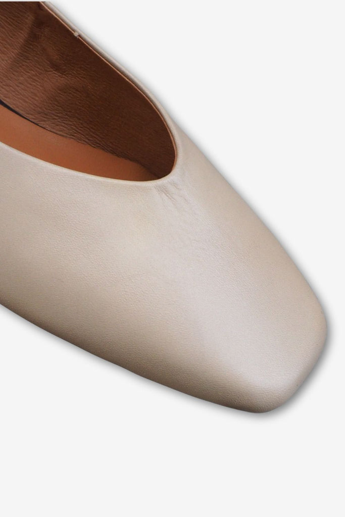 Está fabricada en piel muy suave, flexible desde el primer día, y con un tacón bajo que da estabilidad sin restar ligereza. Una bailarina sobria, depurada y pensada para acompañarte en tu día a día: trabajo, planes tranquilos o cualquier look donde quieras verte arreglada sin esfuerzo.