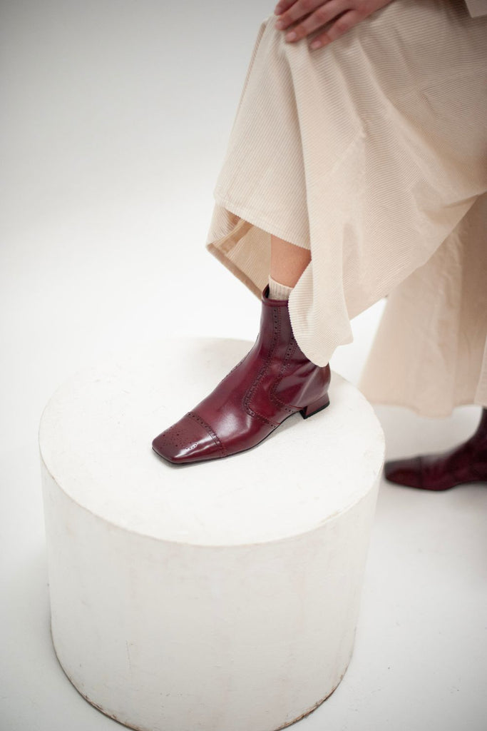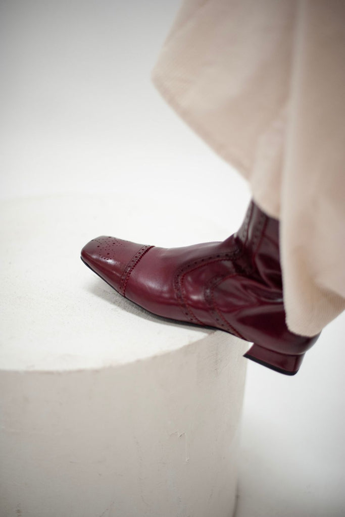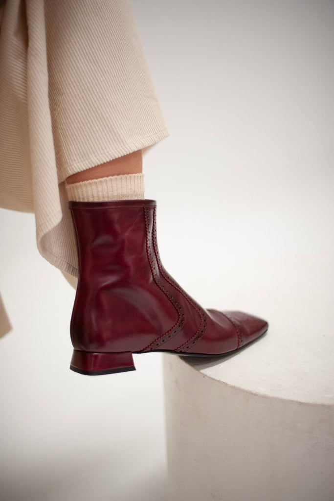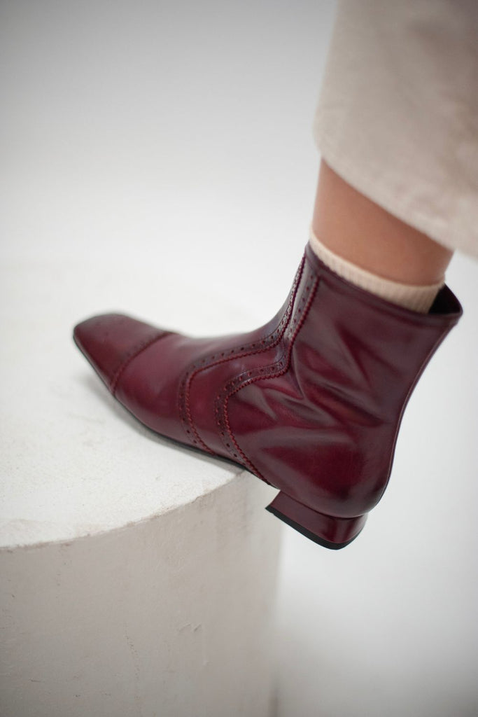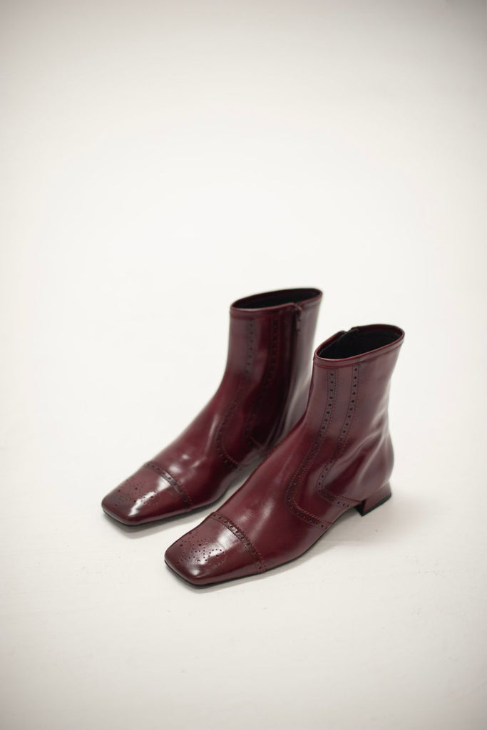 Botín de piel en color granate con punta cuadrada y detalles decorativos. Presenta un efecto degradado hacia la punta y cierre con cremallera lateral para mayor comodidad. Su tacón bajo de 3 cm lo convierte en un básico elegante y fácil de llevar.