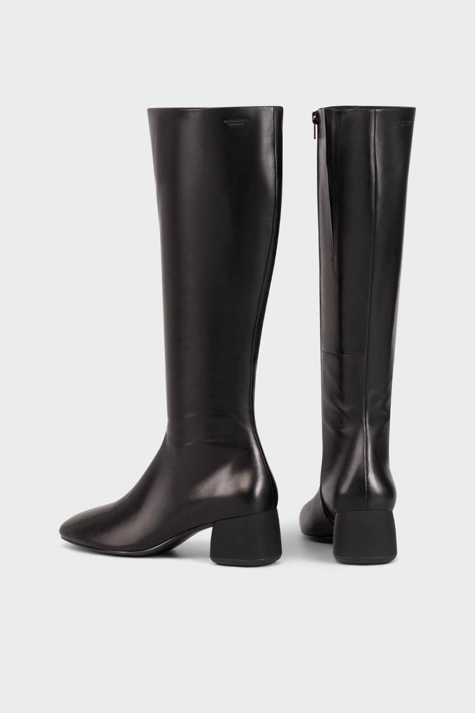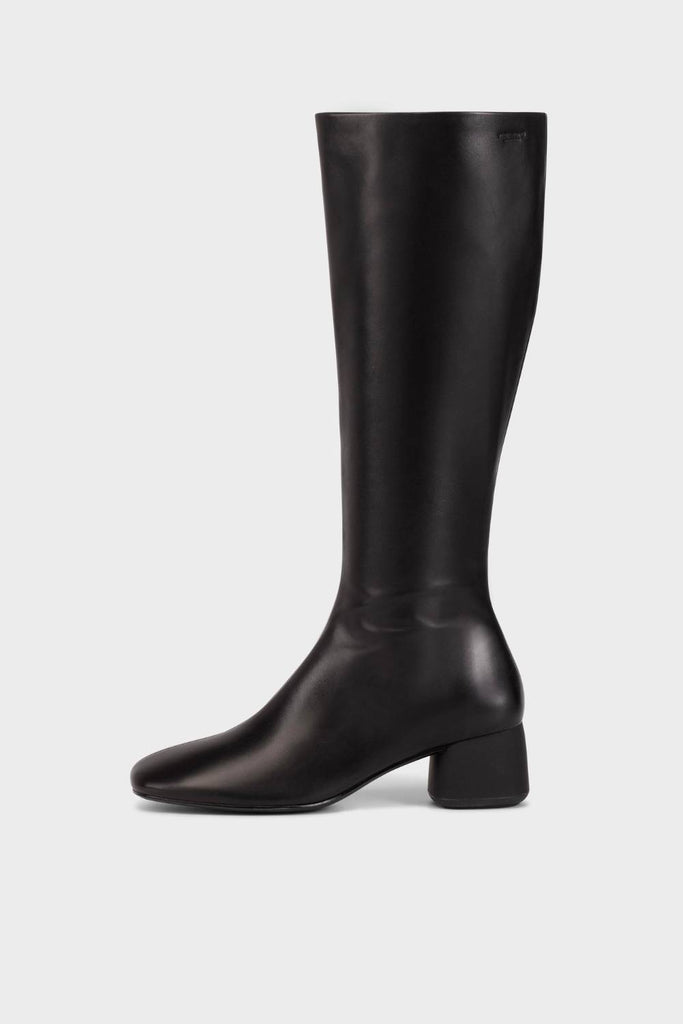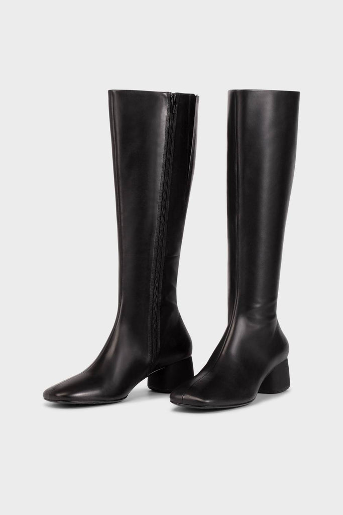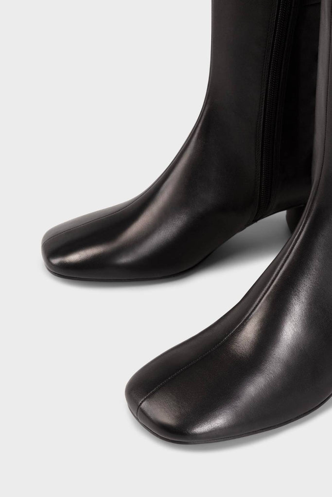 Livia es una bota alta de estilo minimalista y atemporal. Confeccionada en piel de vaca de origen portugués en color negro, destaca por su puntera redondeada, el cierre de cremallera lateral y un tacón sólido de 50 mm que aporta estabilidad y elegancia. Su diseño limpio la convierte en una opción versátil para combinar con diferentes looks de temporada.