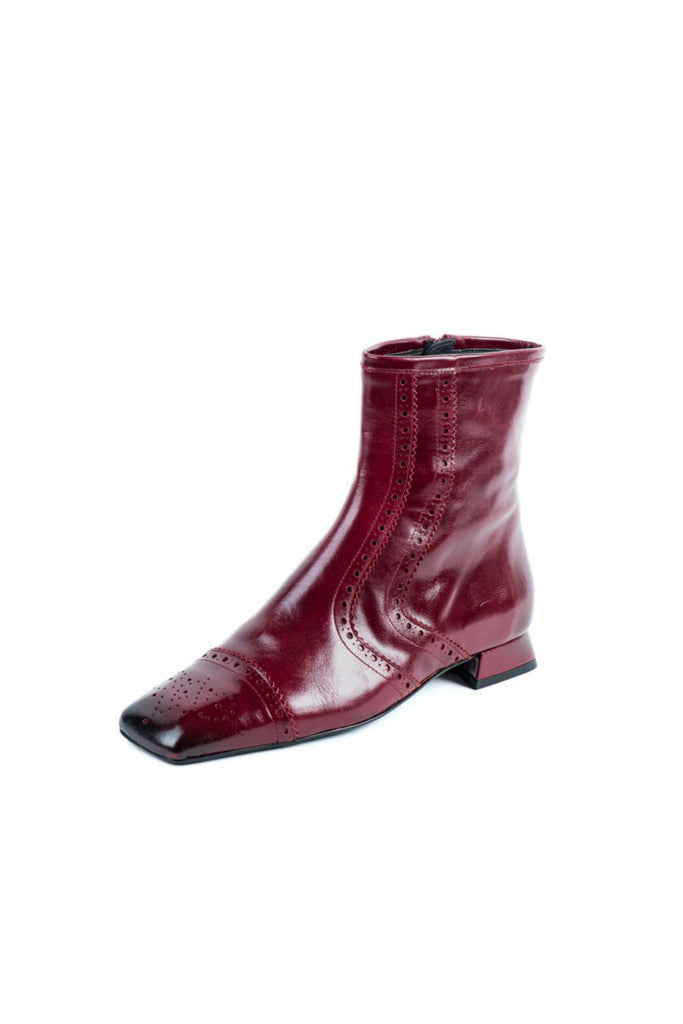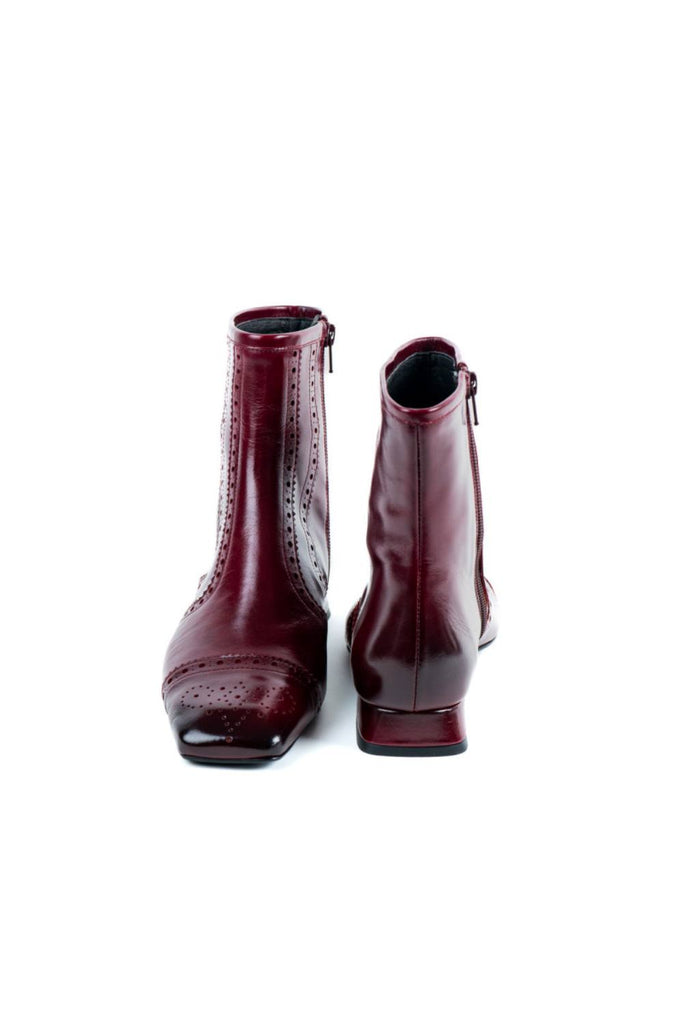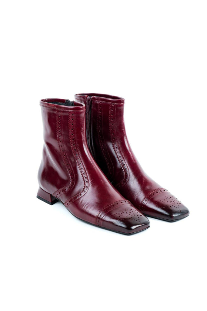 Botín de piel en color granate con punta cuadrada y detalles decorativos. Presenta un efecto degradado hacia la punta y cierre con cremallera lateral para mayor comodidad. Su tacón bajo de 3 cm lo convierte en un básico elegante y fácil de llevar.