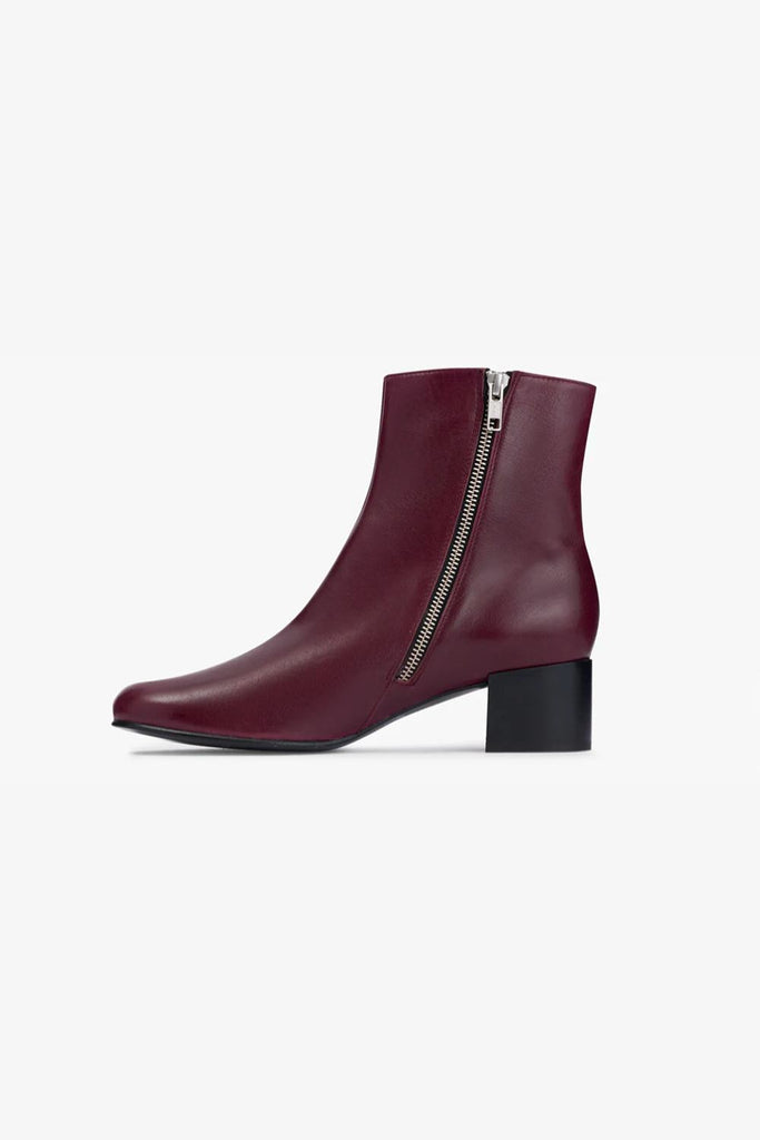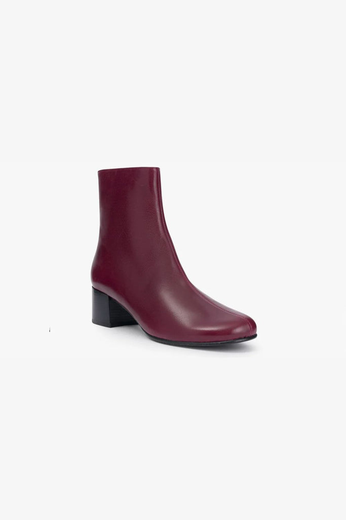 Bota de horma redonda en piel de becerro granate con tacón forrado en suela negra. Altura de 4,5 cm, suela de cuero y cremallera metálica. Hecha a mano en Petrer, Alicante, por los hermanos Rico.