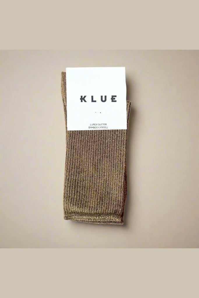 Calcetines brillantes de caña media en Lyocell de bambú con hilo lurex. Suaves, sostenibles y con un toque elegante y festivo. Fabricados por Klue en una gama de colores refinados.