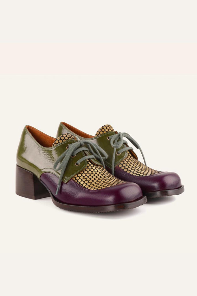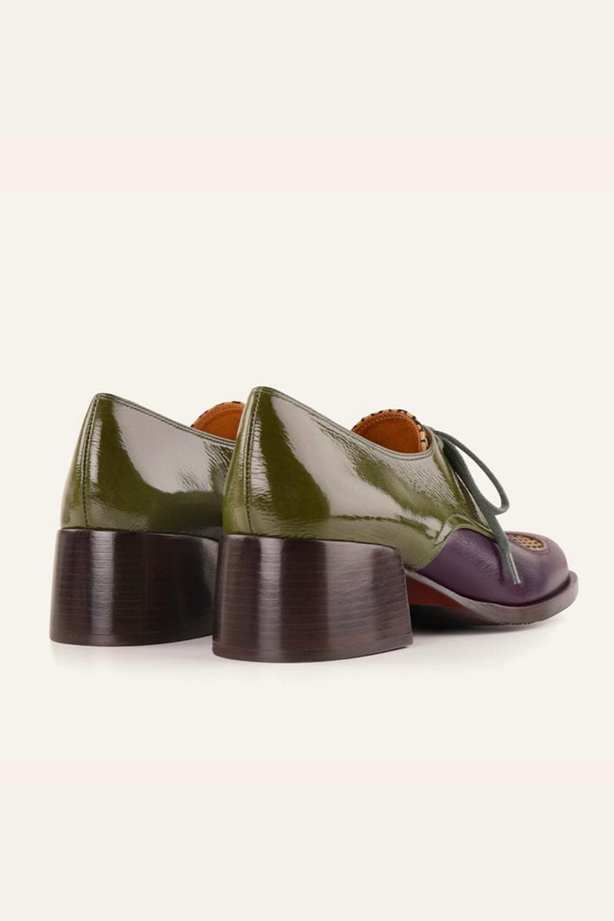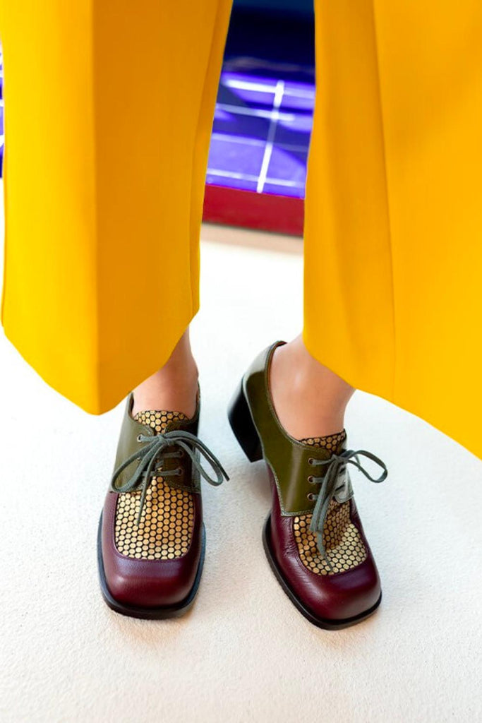 El modelo Brand Multi destaca por su juego de texturas: piel lisa, ante estampado y charol laminado en tonos burdeos, oro y verde militar. Su diseño con cordones aporta un aire clásico y diferente, mientras que el tacón bajo de 4 cm lo convierte en una opción muy cómoda para el día a día. La suela combina cuero y goma para mayor durabilidad y confort.