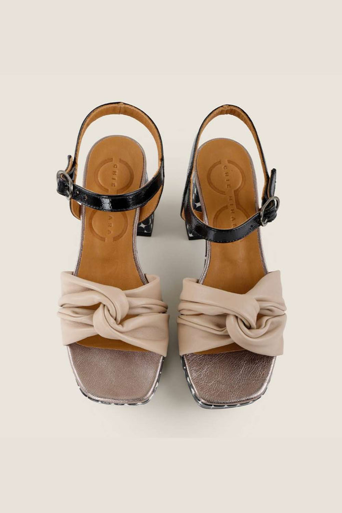 La sandalia Gelisa Tan destaca por su diseño envolvente, femenino y con un punto retro. Su pala en napa extremadamente suave se anuda sobre el empeine, aportando volumen y movimiento, mientras que la base en piel metalizada añade un guiño brillante. El cierre de charol negro, junto al tacón y plataforma forrados en piel estampada con lunares, da el toque final a un modelo tan cómodo como original.
