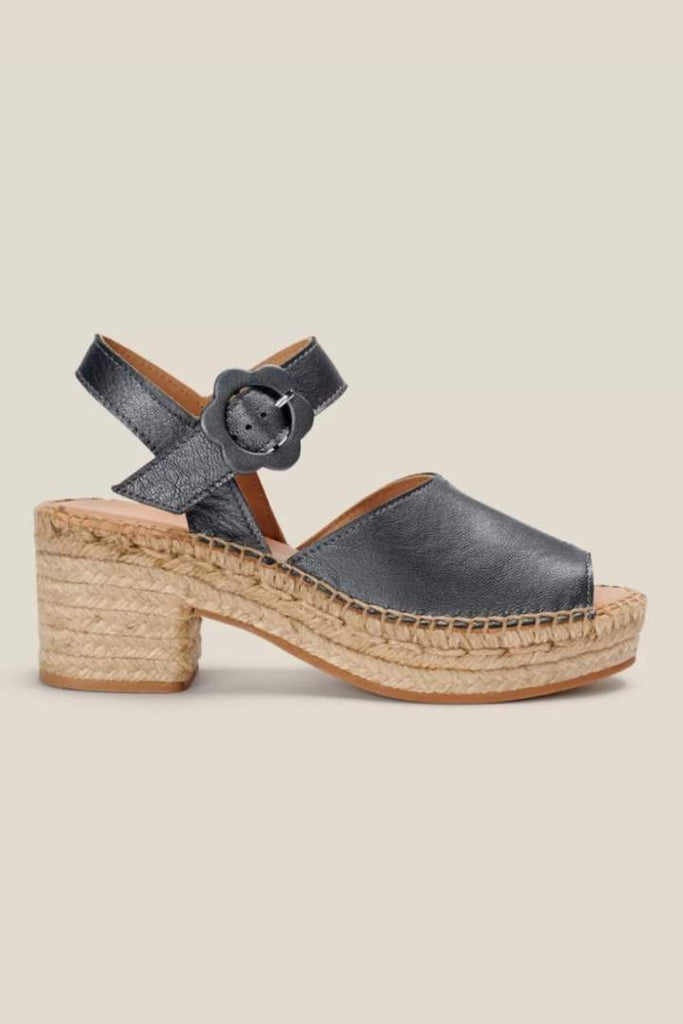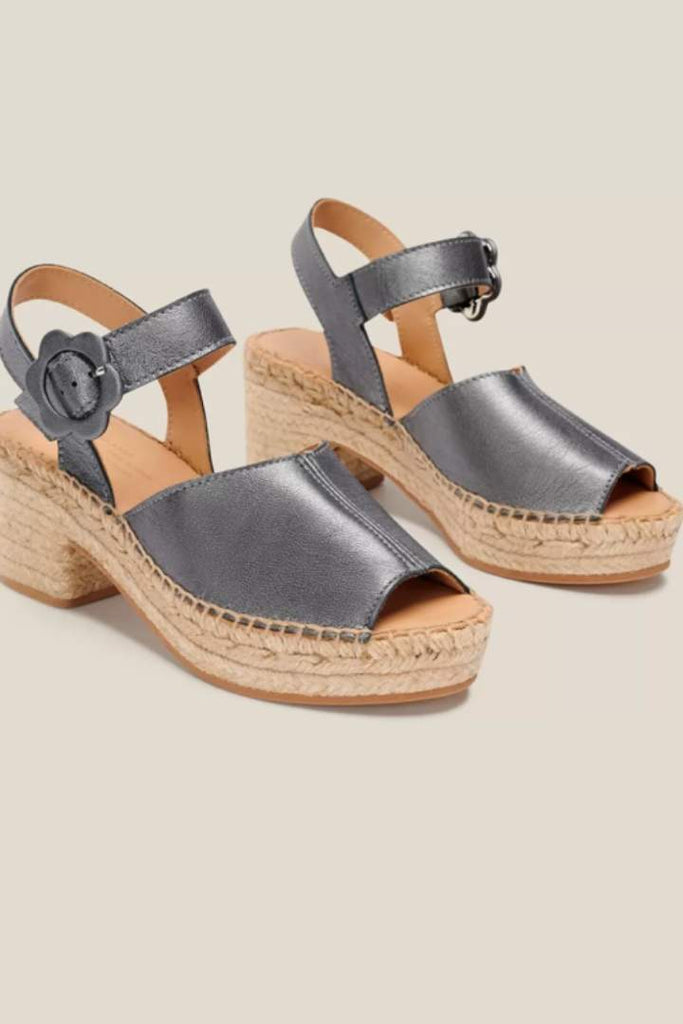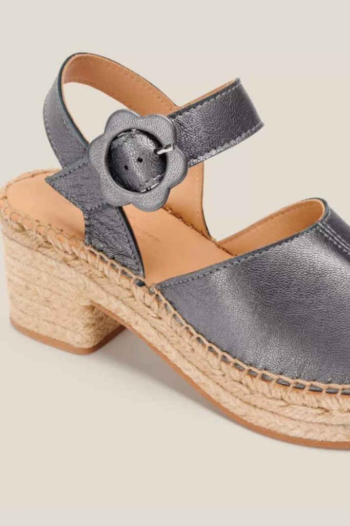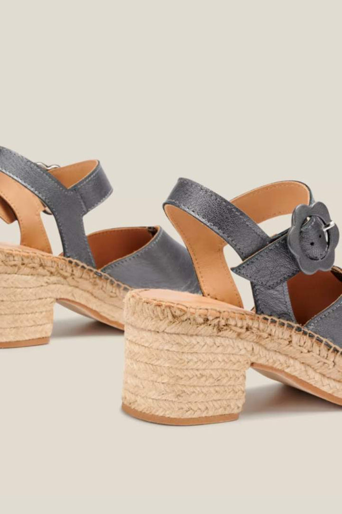 Fumarola es una sandalia de punta abierta, se ajusta con una correa al tobillo y hebilla forrada al tono de la piel. Los cortes son en piel de cordero con acabado metalizado. Forro de piel. La planta es acolchada con foam y forrada de piel vacuna natural para dejar transpirar mejor tu pie. El piso es de yute con tacón ancho y plataforma para mayor comodidad, la suela de cuero con ranuras antideslizantes. La altura total es de 7 cm.