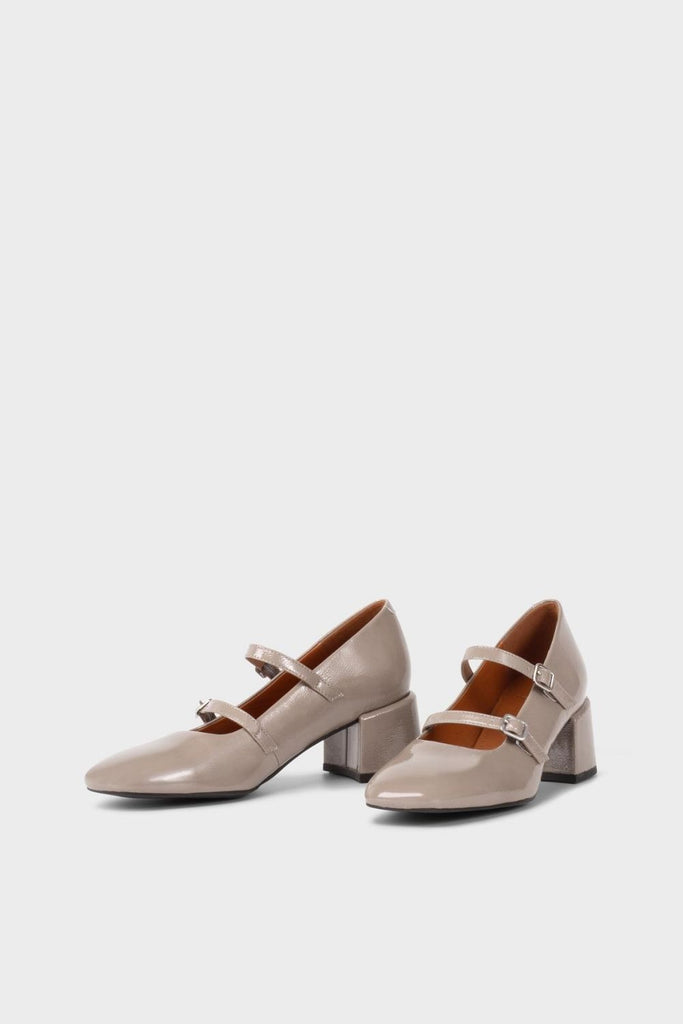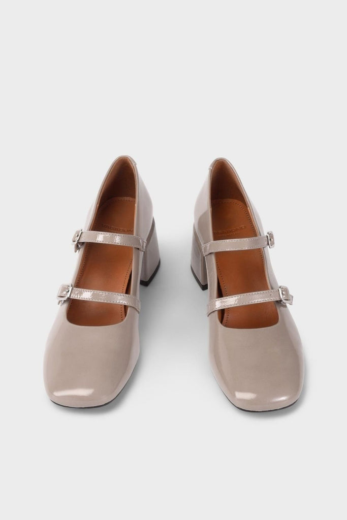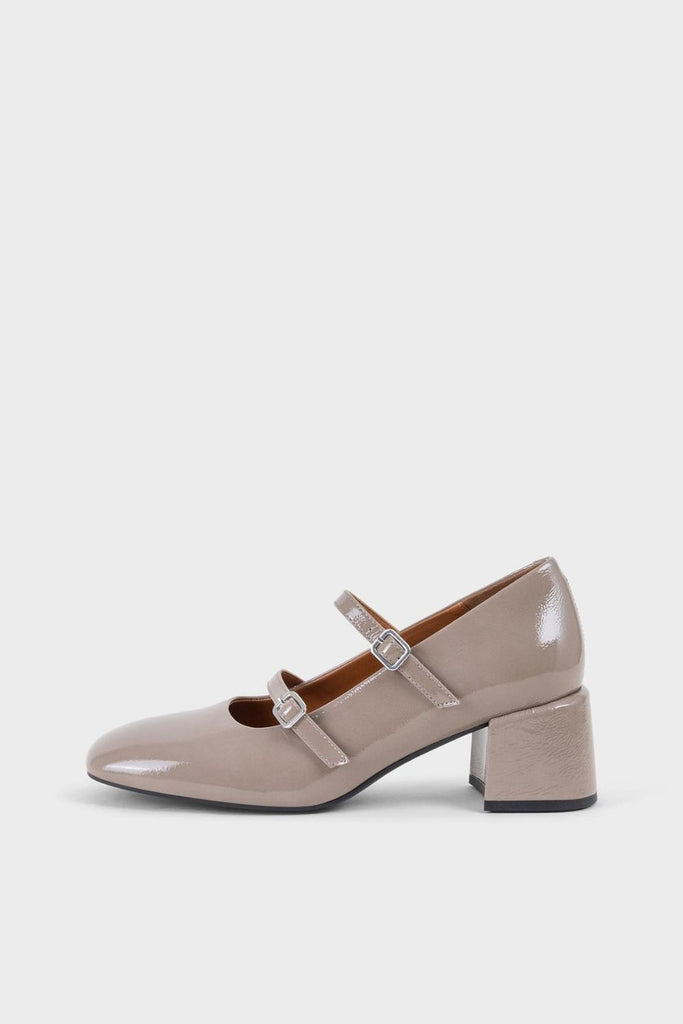 Zapatos Mary Jane de Vagabond en charol marrón claro con puntera redondeada, tiras ajustables con hebillas y tacón de bloque de 5,5 cm. Un diseño sofisticado que se adapta a cualquier ocasión.