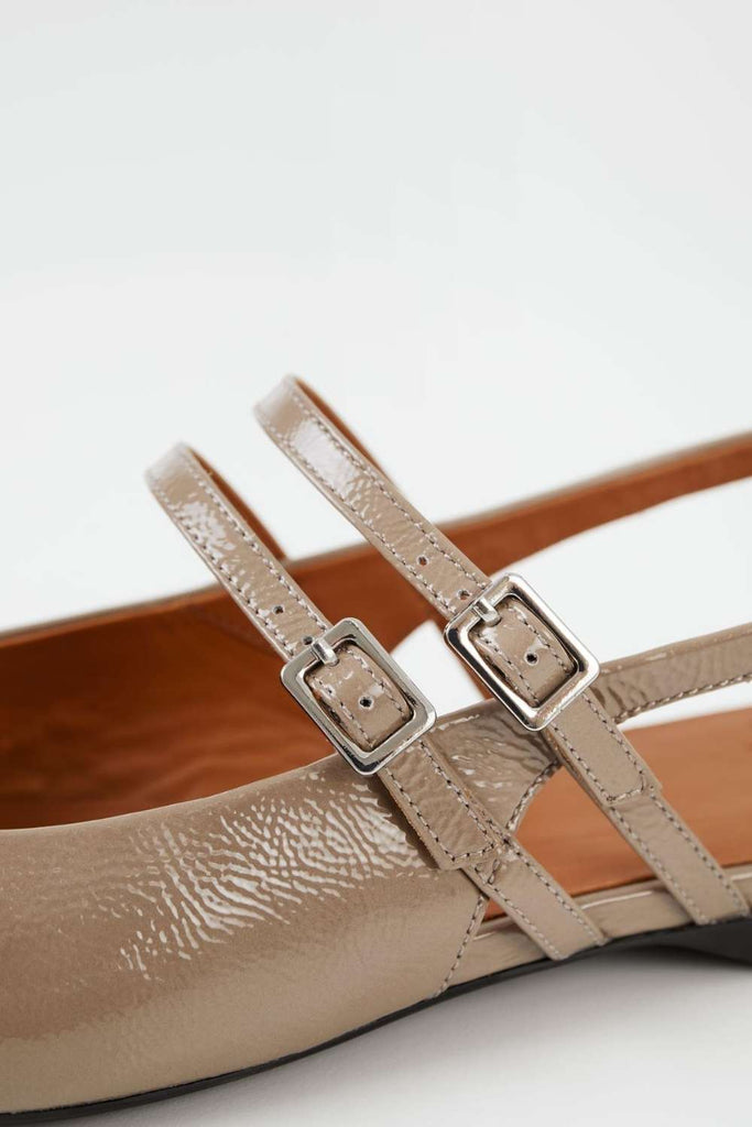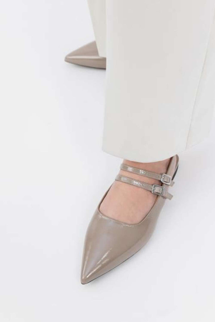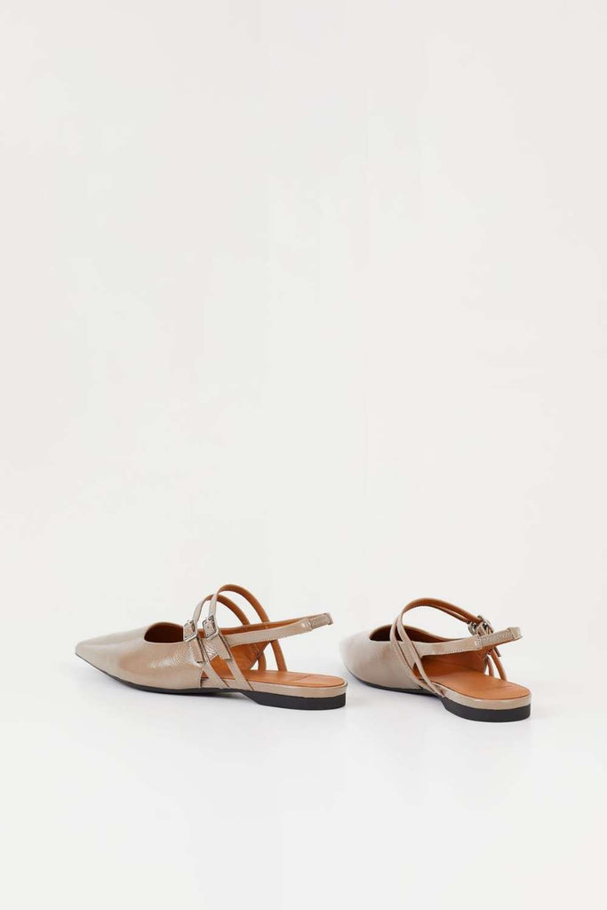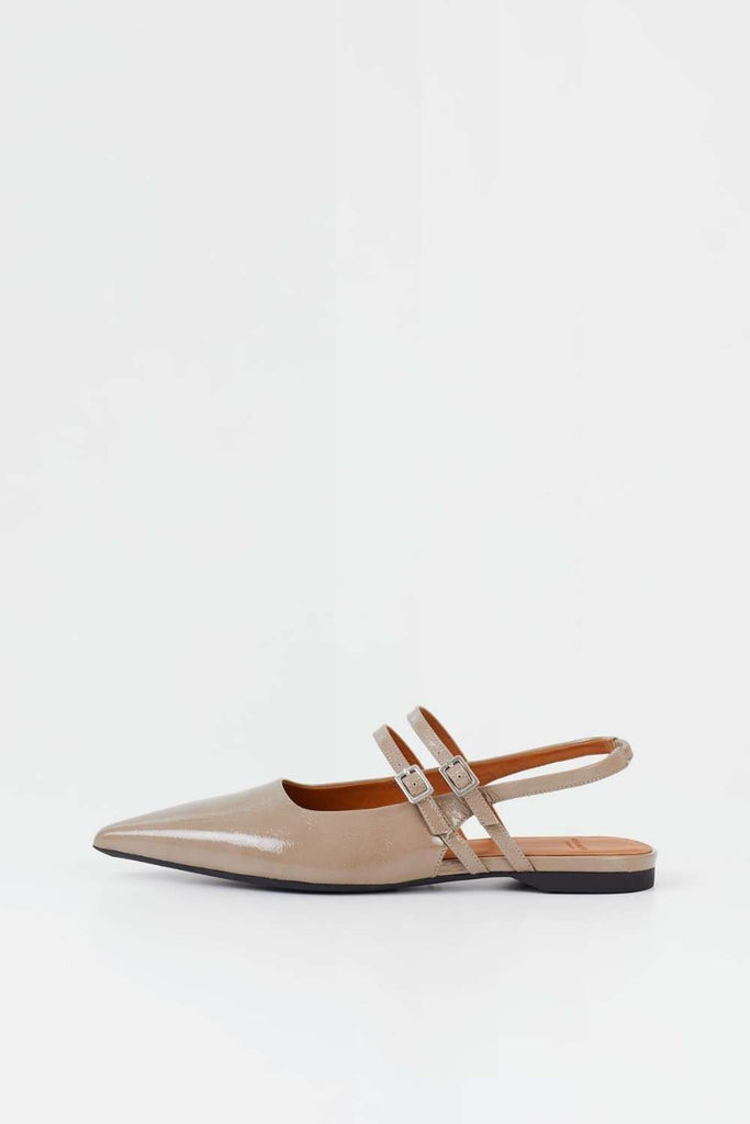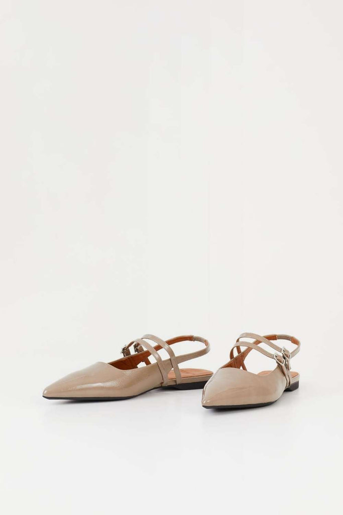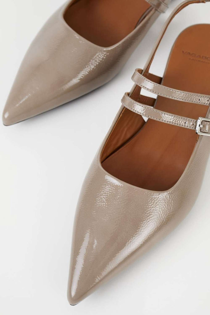 Zapatos slingback planos de Vagabond en charol beige con puntera afilada, doble tira ajustable y tacón bajo. Elegancia discreta con carácter urbano.