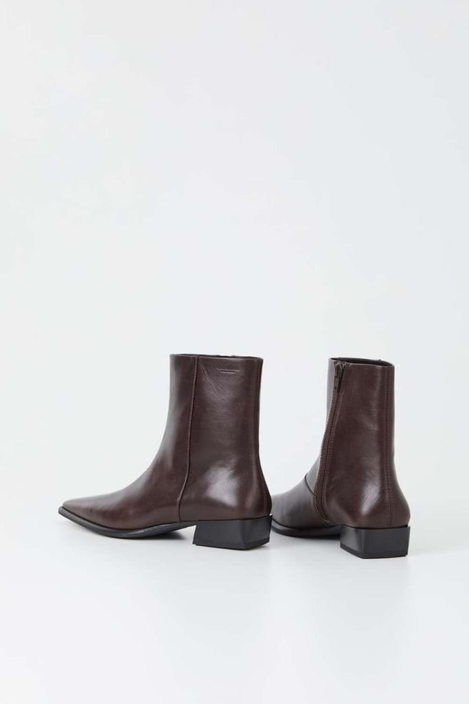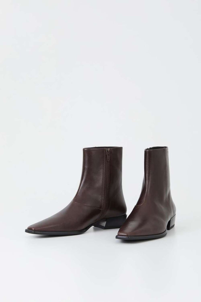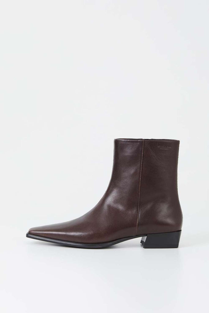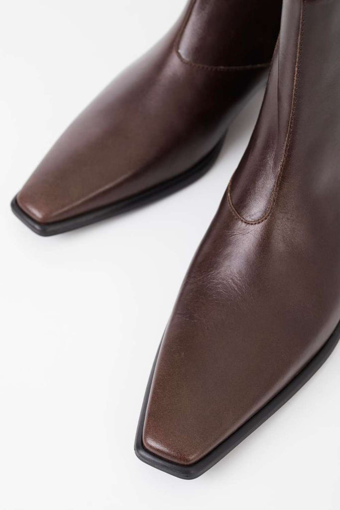 Nella son botines elegantes con un look contemporáneo. El modelo está confeccionado en cuero marrón oscuro con puntera alargada y cierre de cremallera en el lateral. El tacón bajo mide 31 mm.