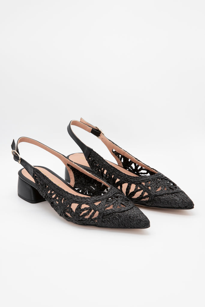 Slingback de rafia negra con patrón calado, plantilla de piel acolchada y tacón bajo forrado en napa. Fresco, cómodo y fácil de combinar.