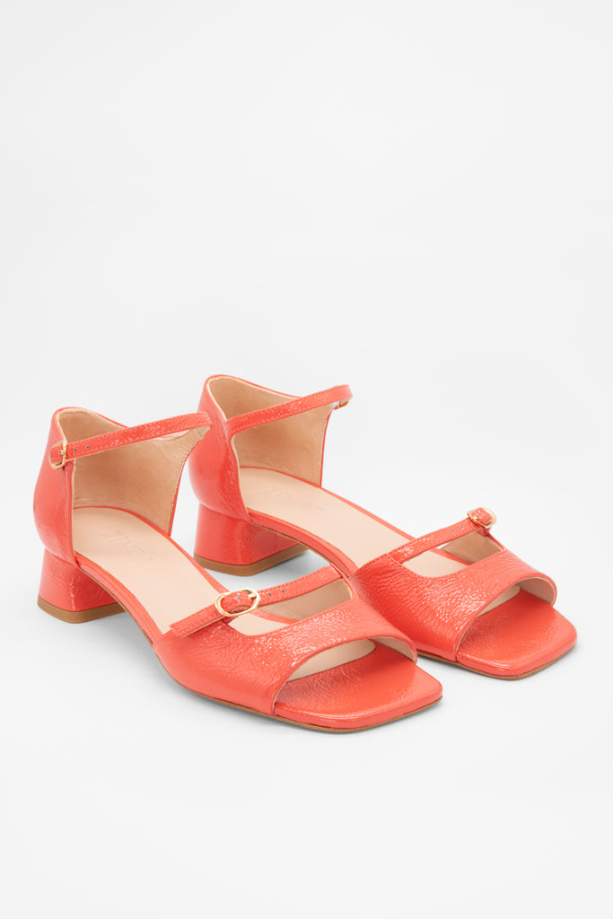 Sandalia de piel acharolada en tono coral. Tacón ancho de 3 cm, cierre con hebilla al tobillo y tira fina ajustable en el empeine.