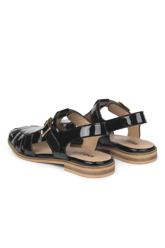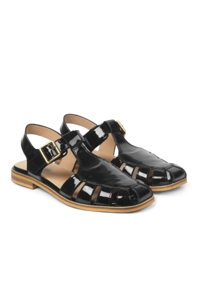 Sandalia clásica cangrejera en piel con acabado charol. La sandalia presenta puntera en forma de almendra, talón abierto, tira ajustable al tobillo con hebilla dorada, plantilla de piel acolchada y suela ligera de tunit. Confeccionado en piel natural y transpirable.