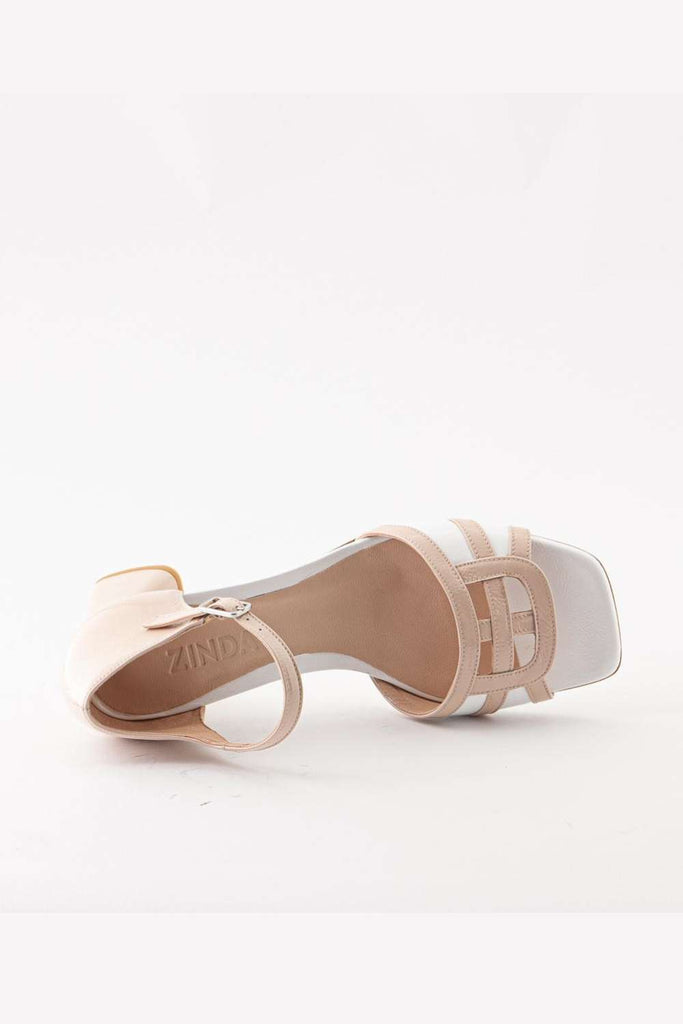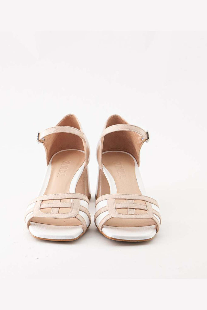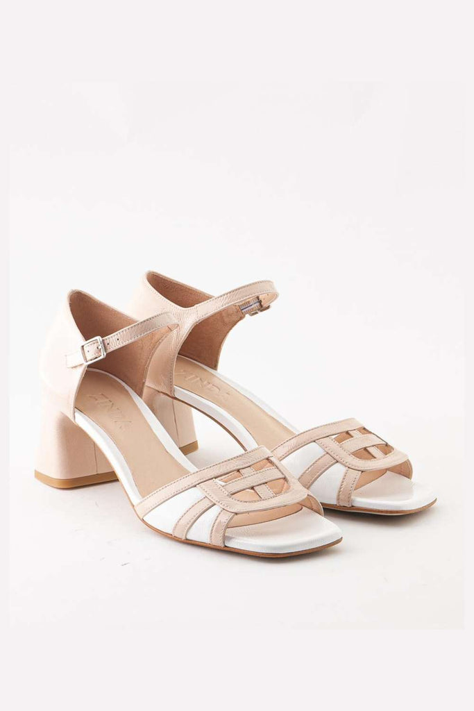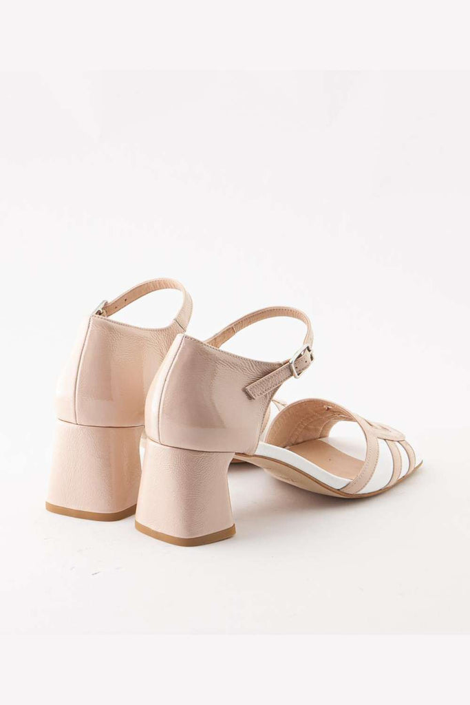 Sandalia de piel acharolada en nude y blanco. Tacón ancho de altura media, cierre con hebilla al tobillo y diseño geométrico en el empeine.